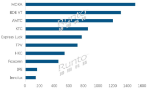 В августе из 10 профессиональных заводов, включенных в статистическую выборку, у трех наблюдался рост, а у семи — спад, причем наблюдались как существенные, так и существенные увеличения. MOKA, BOE VT и Foxconn продемонстрировали рост поставок в годовом исчислении, причем у BOE VT и Foxconn рост превысил 100% и 20% соответственно. Из семи заводов, столкнувшихся со спадом, у шести поставки сократились более чем на 10%.